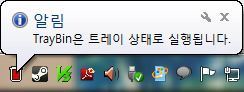 ▲ TrayBin을 실행시키면 아무런 창도 뜨지 않습니다. 대신, 트레이에서 프로그램이 실행되었다는 알림이 나오죠 ㅎ