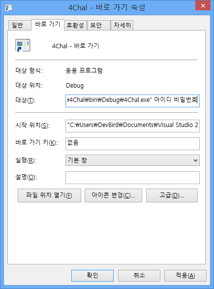 3. `바로 가기` 탭의 `대상` 항목에서 맨 뒤에 한칸을 띄우시고