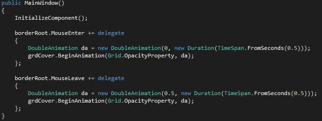 <DoubleAnimation Storyboard.TargetName="grdCover" Storyboard.TargetProperty="Opacity" To="0" Duration="0:0:0.5" />